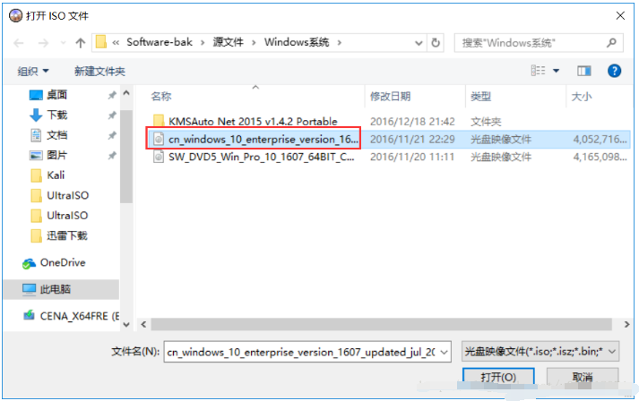 3、在对话框中选择刚下载的win10系统镜像文件,点击“打开”。