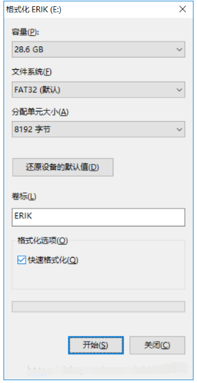 6、点击“格式化”进行格式化U盘(U盘内资料需提前备份),“文件系统”选择“FAT32(默认)”,点击“开始”,等待格式化完成后点击“确定”并关闭。