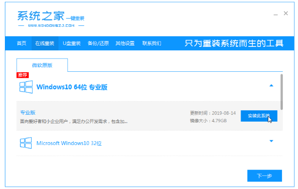 1.下载安装好系统之家一键重装软件并打开,点击在线重装,选择需要安装的win10系统,点击下一步。