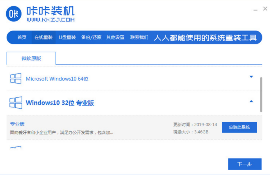 1、下载咔咔装机工具,点击在线重装系统。选择需要安装的系统版本,点下一步。