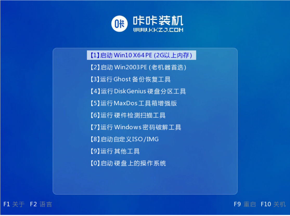 3、把u盘启动盘插入电脑中,开机不断按启动快捷键进启动界面,选择u盘启动项回车进入咔咔pe系统。