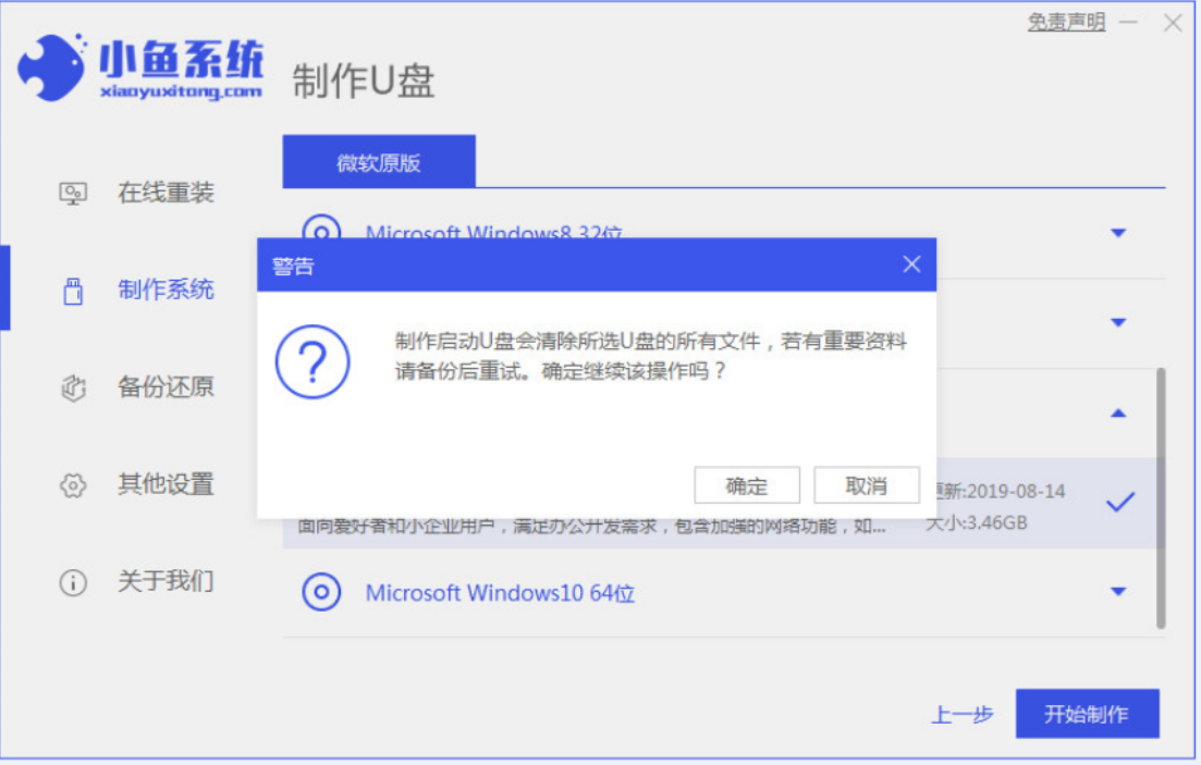 1、下载安装小鱼重装系统软件并打开,插入u盘点击开始制作。