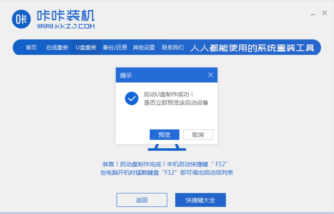 3、软件自动制作u盘启动盘,完成之后,预览需要安装的电脑的启动快捷键,拔出u盘。