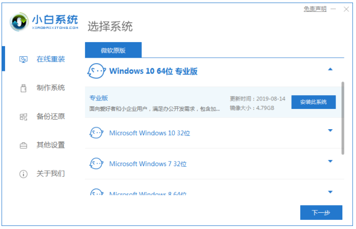 1、首先在浏览器查找下载安装小白一键重装系统软件选择windows10系统,点击下一步。