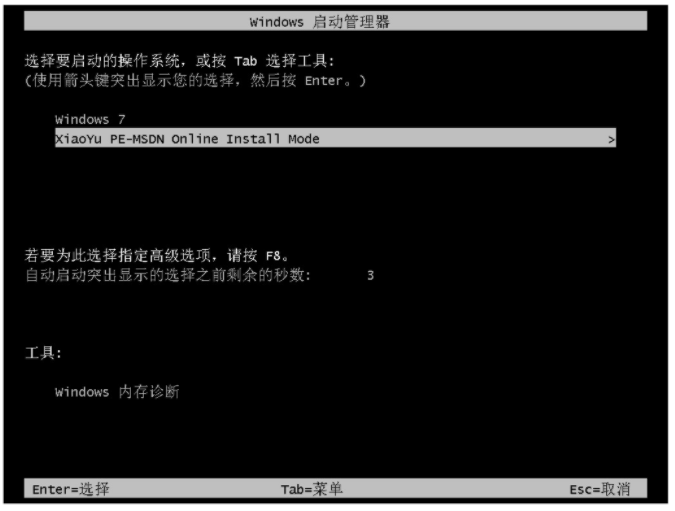 4、电脑重新重启之后会出现windows管理器界面,选择第二个选项按回车键进入小鱼的pe系统当中。
