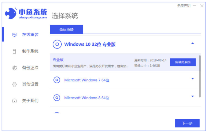 1、打开小鱼一键重装系统软件,选择win10系统;