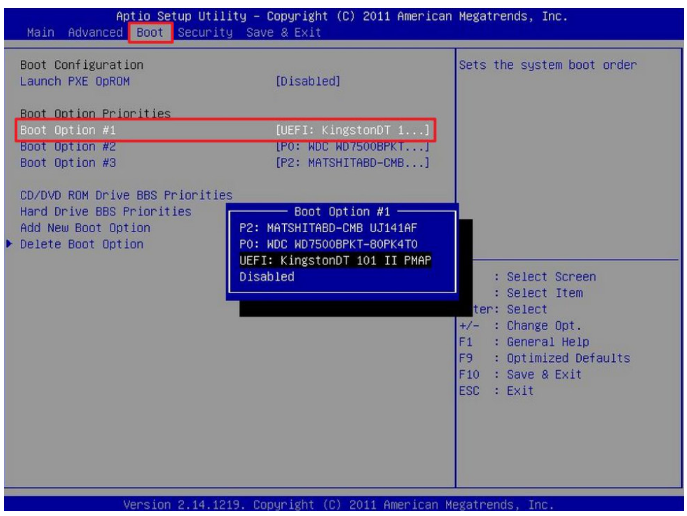 6、进入界面之后在Boot界面里选择Boot Option #1,接着再选择UEFI:KingstonDT 101 II PMAP。