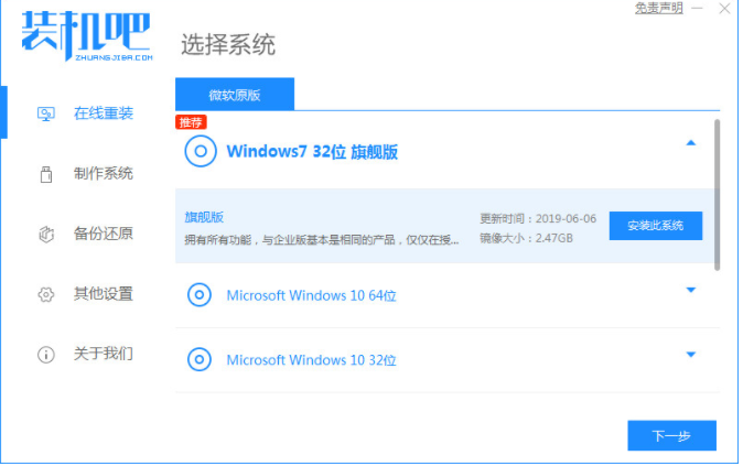 1、在电脑上下载安装好装机吧一键重装系统软件并双击打开,选择我们需要安装的win7系统,点击下一步。