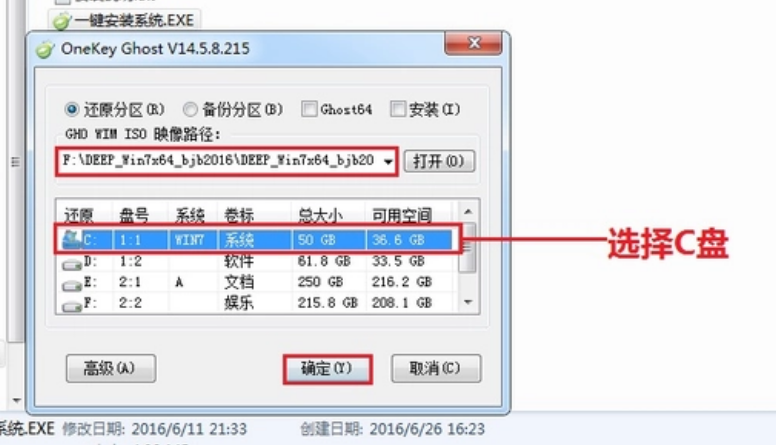 2.减压后,打开一个按钮还原工具,然后选择还原分区,选择.gho格式的系统映像,然后选择C Drive单击OK。