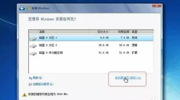 1、重装系统win7分区怎么设置呢?首先选择进入到分区界面,点击“驱动器选项(高级)”。