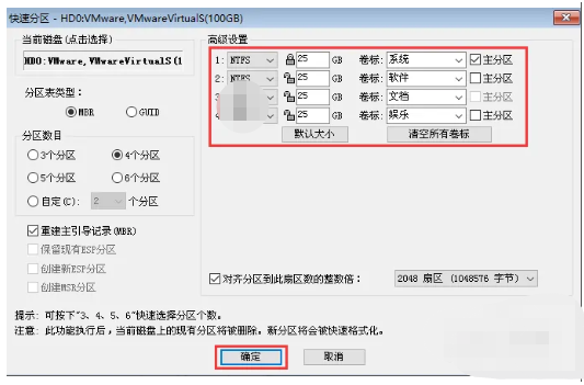 2、电脑进入PE系统之后,点击打开桌面的分区大师,点击快速分区。分配各分区的大小,设置主分区,鼠标再点击确定。在此设定了四个分区,(1)盘为主分区,大家可以根据自己的需要进行设置,分区完成之后,即可通过桌面的韩博士PE装机工具,再点击安装系统进行windows7系统的重装。