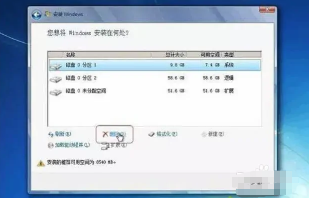 2、如果不需要分区的话,我们只需要选择分区1(类型为“系统”的分区),点击格式化,如果要全盘分区,则选择分区,然后点击“删除”即可。