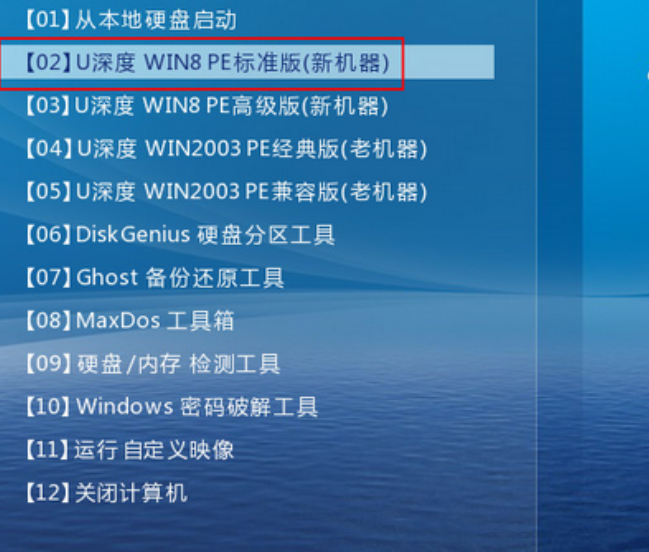 使用u盘启动盘进入u深度主菜单,选择【02】u深度Win8PE标准版;