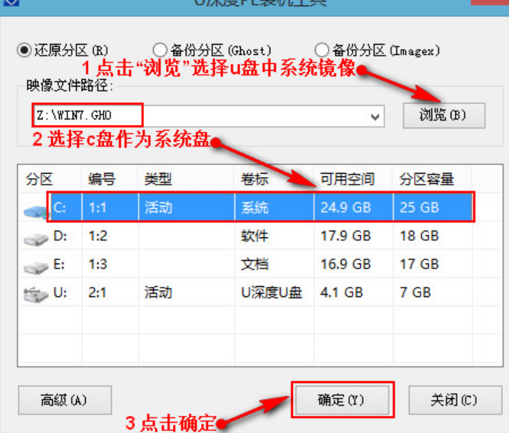 进入pe后会自启u深度pe装机工具,首先点击"浏览"将保存在u盘的系统镜像添加进来,接着选择c盘作系统盘存放镜像,点击“确定”即可。