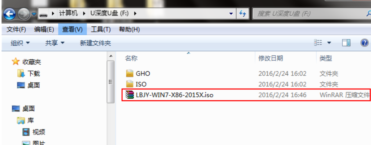 1、将准备的的win7系统镜像包存储到已做好的u深度u盘启动盘根目录中。