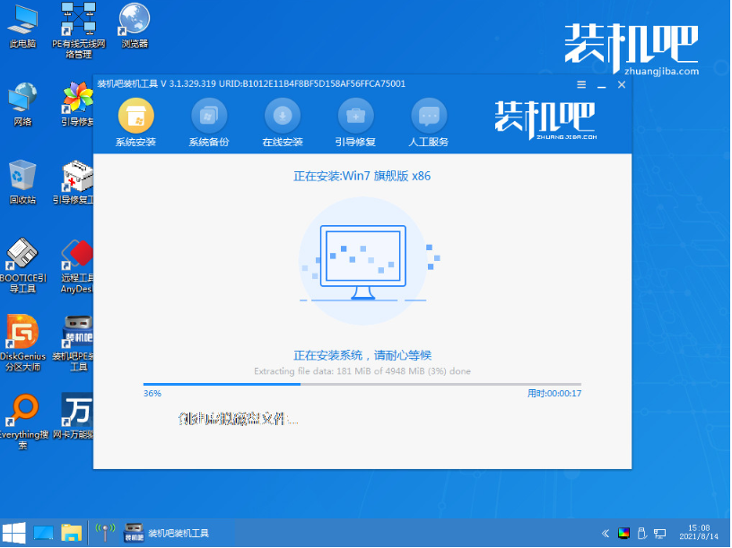 4、进入pe后,装机吧装机工具自动安装win7系统,安装完成后重启电脑。