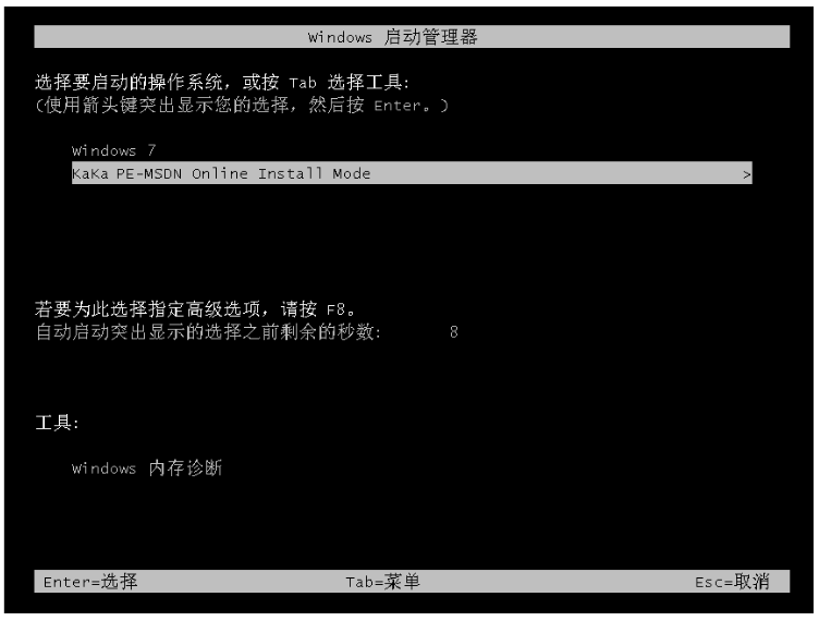 5、重启电脑之后,请大家通过咔咔装机的PE系统按回车键进入电脑pe系统界面。