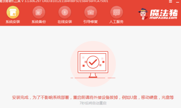 6、安装完成后选择重启电脑,重启之前我们要拔掉外接设备。