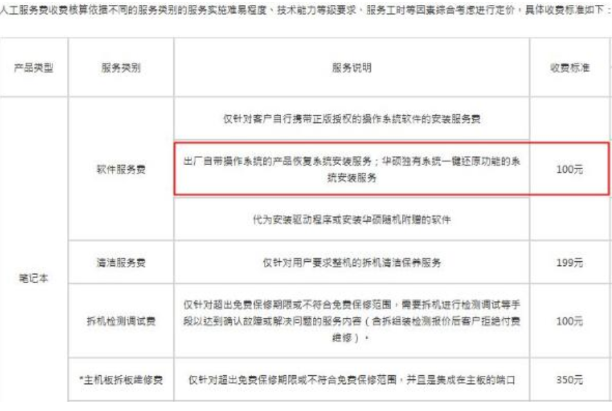 3、华硕电脑售后系统安装收费标准是100元,实际可能会根据难易程度而增加费用。