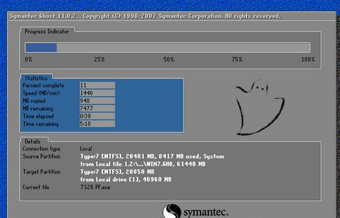 4、进入win7系统还原过程,等待执行完毕。