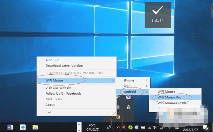 3、鼠标右击"MouseServer"图标,如下图演示。点击"WiFi Mouse→Android→WiFi Mouse Pro"项,下载并安装手机"WiFi Mouse"应用。