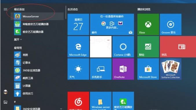 1、启动 Windows 10 操作系统,如下图演示。点击任务栏"开始"按钮,弹出开始菜单选择"MouseServer"项。