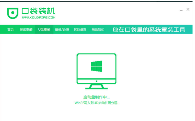 1、在电脑上下载口袋装机工具软件,点击U盘重装系统,将u盘插入电脑,准备制作u盘启动盘,点击开始制作