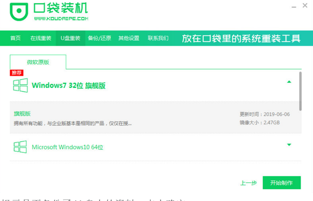 2、选择要暗黄的系统版本,点击开始制作,软件提示是否备份了U盘内的资料,点击确定。