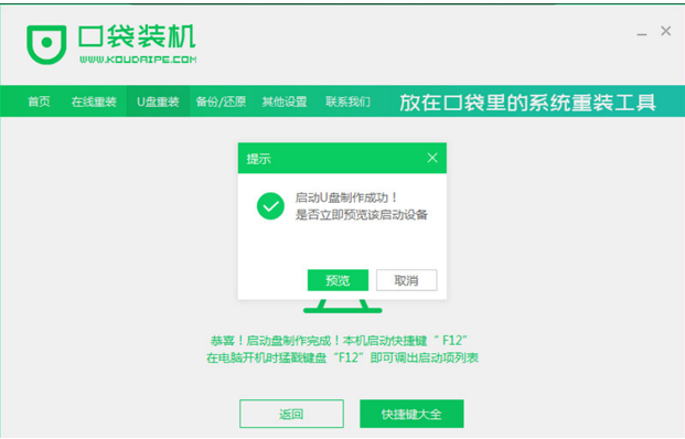3、等待下载系统资料,提示启动盘制作成功后,拔出U盘,点击预览,记住自己电脑型号的启动热键。