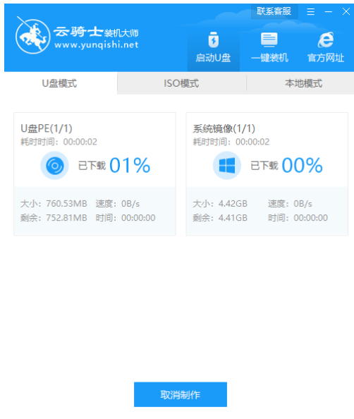 1、首先在云骑士官网下载云骑士一键重装系统软件,下载后打开云骑士装机大师,需要先制作一个U盘启动盘,选择启动U盘界面,并在计算机上面插入U盘,点击制作U盘启动盘。参考下图: