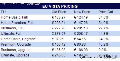 在法国、德国、西班牙等其他欧盟国家,Vista降价范围更广,家庭基础版、家庭高级版、旗舰版和商业版的全新购买与升级价格几乎全部大幅下滑,其中家庭高级版升级价格从150.4欧元降至80.9欧元(-46.2%),旗舰版全新售价也从373.7欧元降至208.2欧元(-44.3%),唯有商业版升级价格不变。