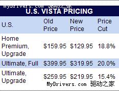 在美国,Vista家庭高级版升级价格从160美元降至130美元(-18.8%),旗舰版升级价格从260美元降至220美元(-15.4%)、完整版价格从400美元降至320美元(-20.0%),降幅均不超过两成。