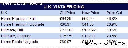 在英国,Vista家庭高级版、旗舰版的全新购买与升级,以及家庭基础版的升级均大幅降价,最少20.5%,最高46.8%——家庭高级版全新售价从94.3英镑降至50.2英镑,旗舰版全新售价也从233.6英镑降至131.92英镑。