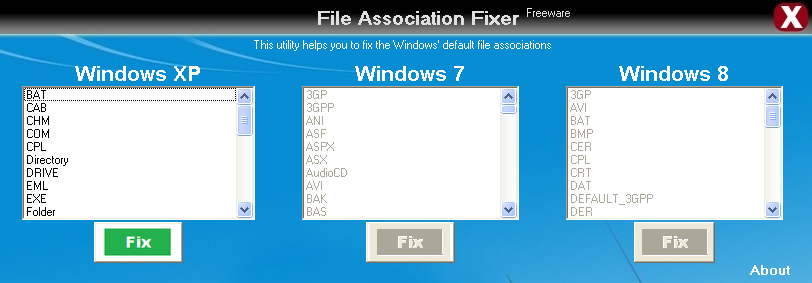 当电脑被病毒攻击或失败程序删除后修复损坏的文件关联。可以使用此实用程序,将 Windows 默认程序的多个文件扩展名相关联。程序功能简单的界面,允许您选择操作系统,你需要修复的文件扩展名。