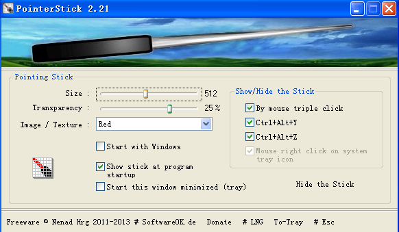 pointerstick是一个便携版的虚拟指针软件。它为你的鼠标添加虚拟的指点棒 ,指点棒会随着鼠标的移动而跟随,并且其大小和形状可以调整。这个小软件在大屏幕数字会议和现场演示时能够帮你轻松突出重点,很有帮助。