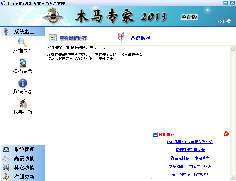 木马专家是一款木马查杀软件 ,软件除采用传统病毒库查杀木马以外,还能智能查杀未知木马,自动监控内存非法程序,实时查杀内存和硬盘木马。第二代查杀内核,支持脱壳分析木马.软件本身还集成了网络入侵拦截,IE修复,恶意网站拦截,系统文件修复,注册表备份和供高级用户使用的系统进程管理和启动项目管理等。有效查杀各种流行QQ盗号木马,网游盗号木马,冲击波,灰鸽子,黑客后门等十多万种木马间谍程序.