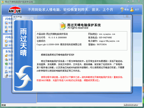 雨过天晴电脑保护系统是一款强大的电脑系统保护和恢复软件,一种多进度多点还原软件,一种不用预留空间的硬盘保护软件,一种一键恢复软件,一种非备份的立即恢复软件,可以迅速清除电脑中出现的软件故障,恢复电脑正常工作状态。雨过天晴电脑保护系统可以迅速恢复瘫痪的操作系统,可以恢复丢失或损坏的文件,可以保护您的电脑免受病毒的侵害,可以确保您的系统安全。