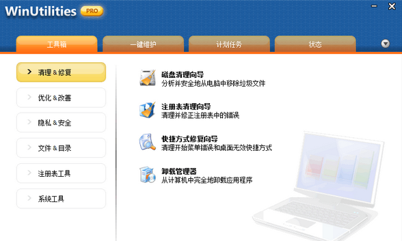 WinUtilities是一套Windows优化工具,提供的功能包括:磁盘清理 、注册表清理/备份、自启动程序管理、内存优化、查找重复文件、快捷方式修复、进程管理、卸载管理、系统信息、文件分割/合并、文件清除、可执行文件加 密、家长监视控制以及调用Windows系统自带小工具等诸多功能。
