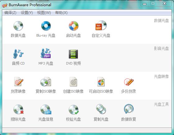 BurnAware的界面清晰简单,功能分类一目了然。它支持我们最常用的CD光盘、DVD光盘的刻录以及最新的蓝光光盘(Blu-ray Disc)的刻录,实在是相当实用。