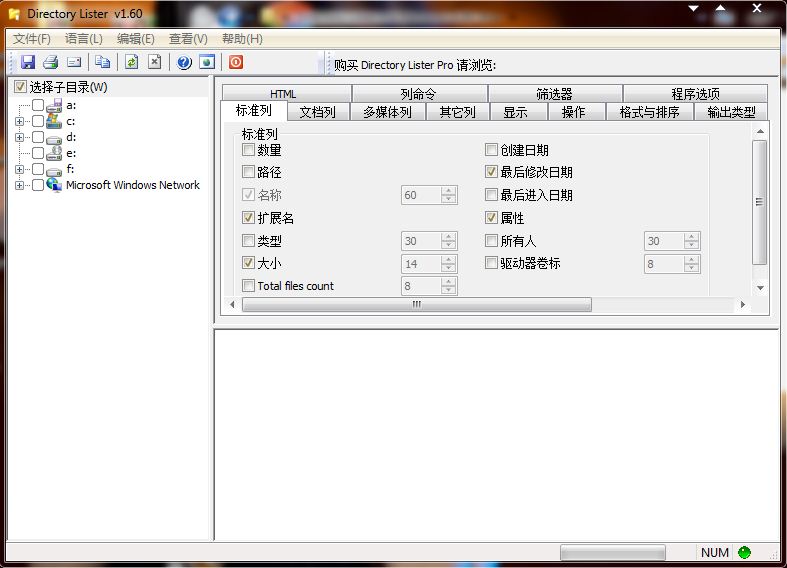 Directory Lister Pro Portable 单文件中文汉化绿色便携破解版是一款非常方便小巧的文件夹列表创建打印工具。售价29美元。Directory Lister Pro可选择显示目录名、目录大小、目录的文件数、子目录、文件序号、文件路径、文件名称、扩展名、大小、日期、时间、类型、 所有者和属性、文件的版本、 说明、 公司信息等等,以及可执行文件 (EXE、 DLL、 OCX) 的信息等,校验值可显示:CRC32, MD5, SHA-1 和Whirlpool,此外还可以列出像轨道、 标题、 艺术家、 专辑、 流派、 视频格式、 像素、音频格式、帧数、 通道等等多媒体属性 (MP3、 AVI、 WAV、 JPG、 GIF、 BMP)信息,并输出或打印。