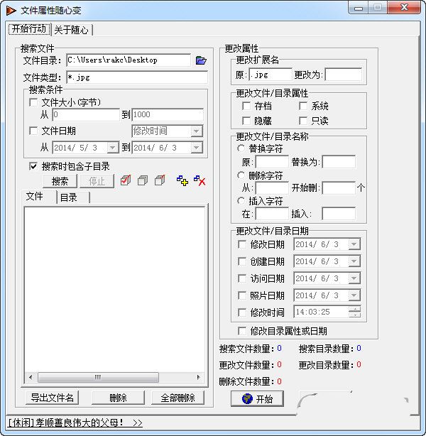 文件属性随心变是一款绿色免费的文件属性批量修改软件。软件功能强大,支持多个文件类型搜索,可以批量更改文件属性,可以批量导出文件名称。