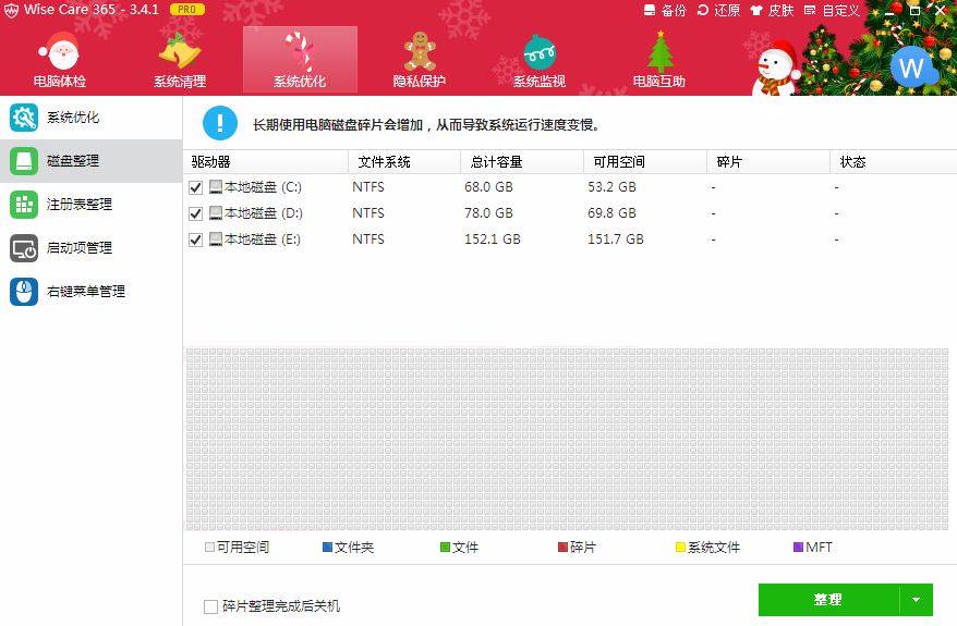 这个里面也包含了4个分类,分别是系统优化、磁盘整理、注册表整理和启动项管理。通过删除不必须要的自启动项、整理磁盘和注册表中的碎片、优化设置参数,windows的使用体验会好上不少;